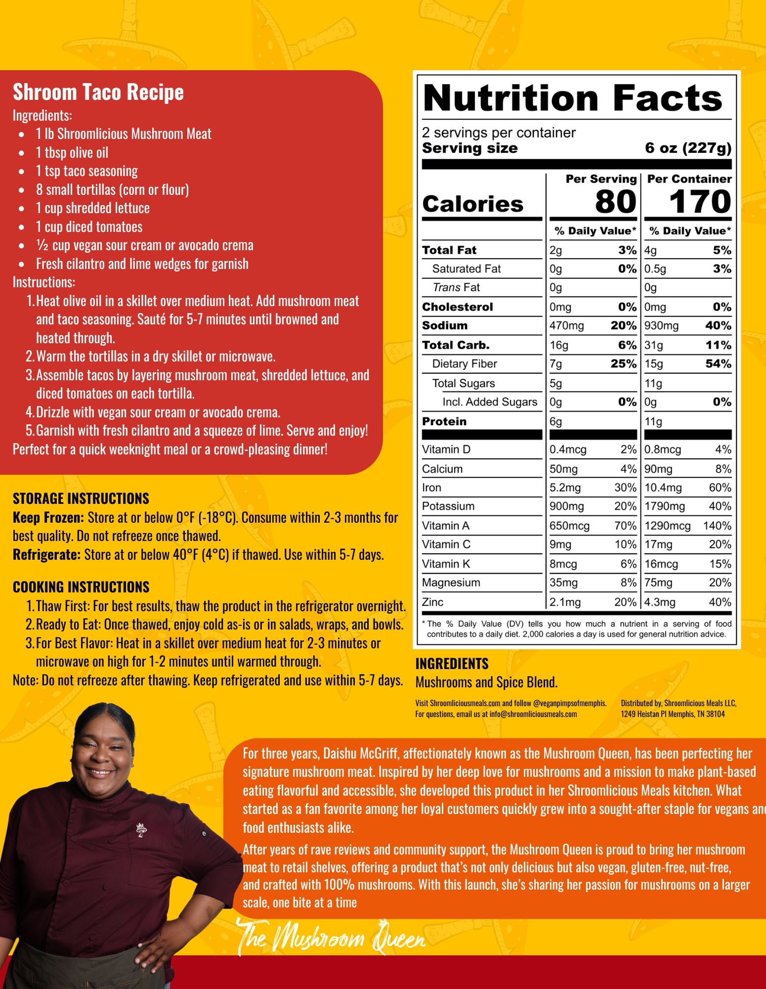 Our signature Mushroom Meat is the heart of The Mushroom Queen’s kitchen — crafted from whole mushrooms and seasoned with our proprietary Shroom Spice blend. No fillers. No soy. Just pure umami power, broken down by hand using our exclusive method to mimic the texture of ground meat with unmatched flavor.